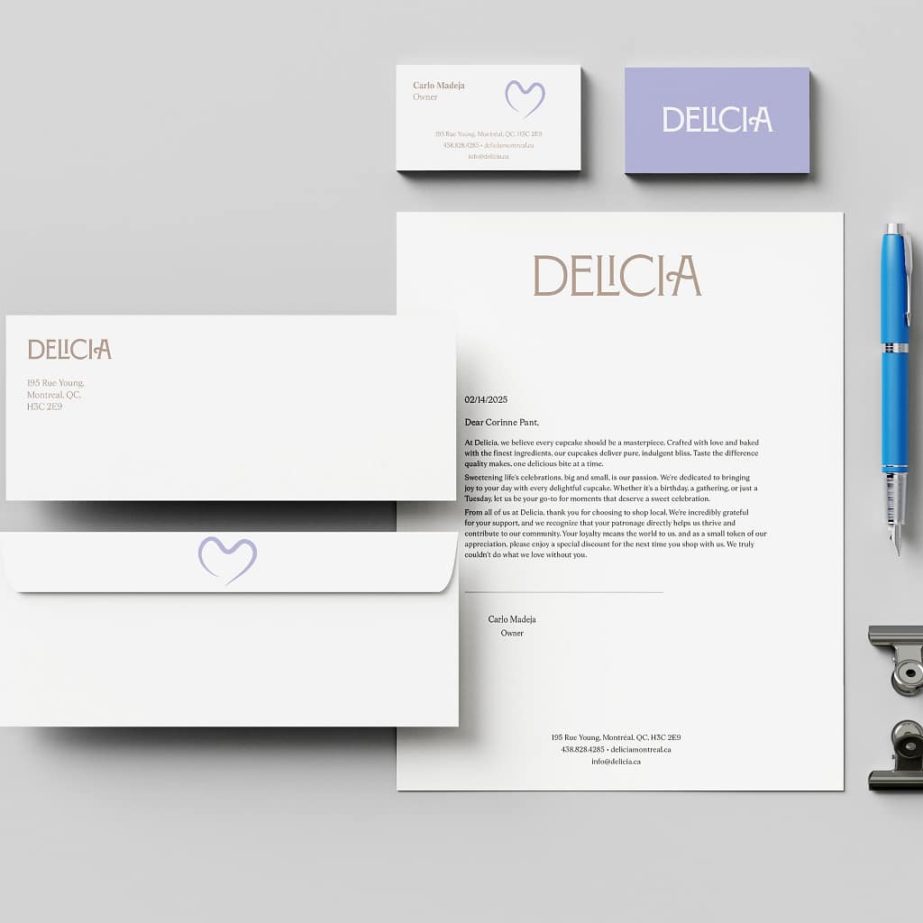 A stationary set for Delicia, a cupcake and sweets bakery.